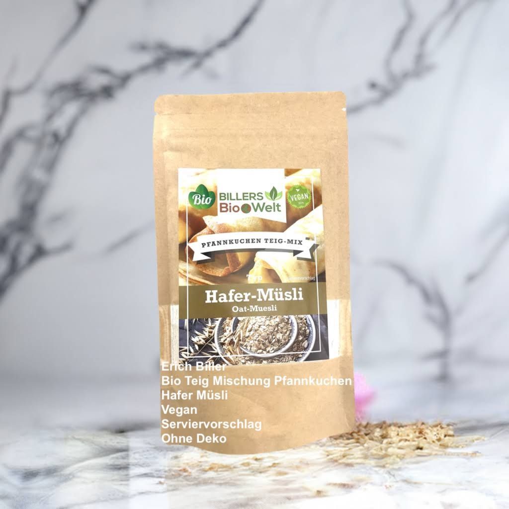 Unsere innovative Pfannenkuchen Teigmischung "Hafer-Müsli" - vegan, bio und einfach zuzubereiten! Dieser Pfannkuchen vereint das Beste aus Haferflocken, Leinsamen, Sonnenblumenkernen, Chia-Samen und Sesam zu einer einzigartigen und köstlichen Textur.